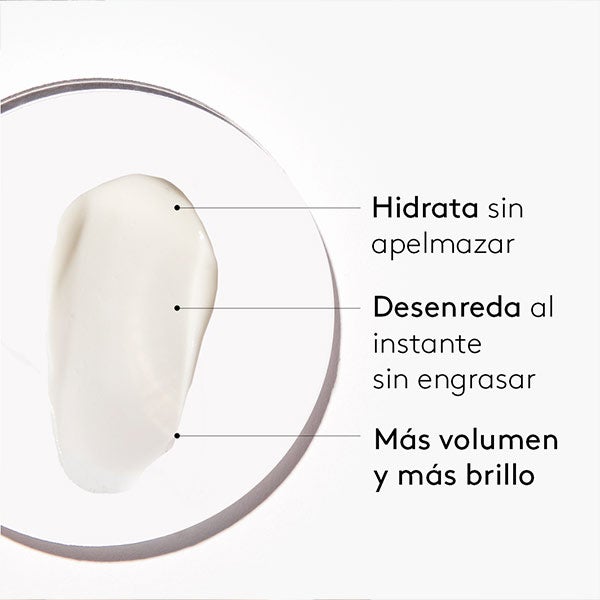 Com seu avançado I+D de ingredientes naturais, possui uma textura extremamente suave e sedosa, mas sem silicones. Diga adeus aos nós e puxões graças ao seu poder desembaraçante imediato. Sua ação de hidratação máxima fortalece as fibras capilares evitando sua quebra, mas sem engordurar. Está formulado com uma combinação de extratos e vitaminas que nutrem sem pesar, proporcionando brilho e vigor.