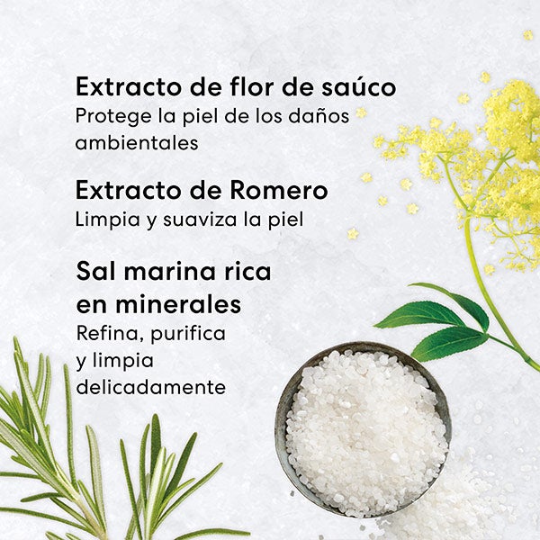 Formulado com sais marinhos ricos em minerais e extratos de flor de sabugueiro e alecrim, limpa a pele de maneira eficaz e suave. Para todos os tipos de pele.