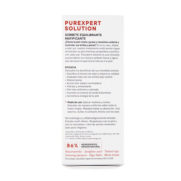 86% ingredientes de origen natural: Alga kylin, Mirto limón, Trébol rojo, Niacinamida, Jengribre azul, Ginseng púrpura.
