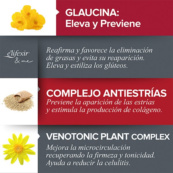 Através de seu inovador Ativo Biotecnológico Multifuncional que se encontra no Glaucium Flavum, favorece a eliminação das gorduras e evita sua reaparição mediante a redução dos níveis de cálcio no interior dos adipócitos. Eleva e estiliza os glúteos, favorece a eliminação de líquidos e reafirma os tecidos.