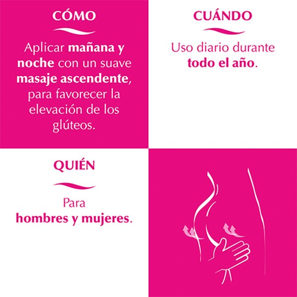 Aplique pela manhã e à noite com uma suave massagem ascendente, para favorecer a elevação dos glúteos e conseguir uma maior absorção.