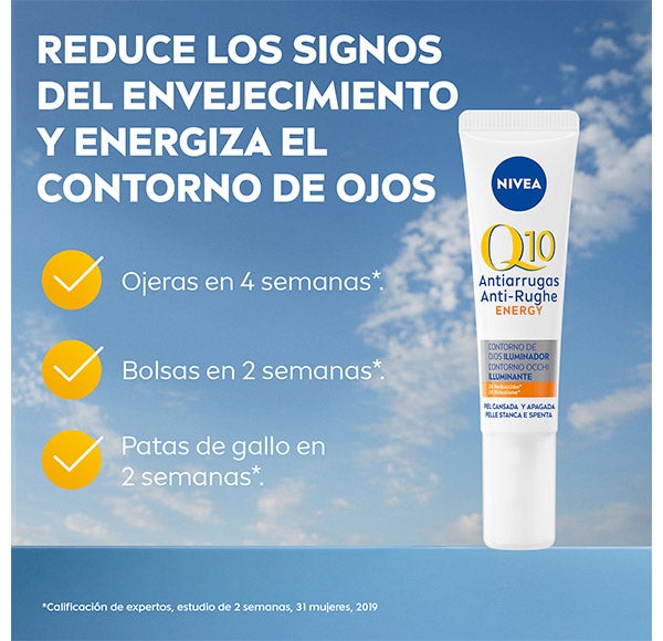 NIVEA Q10 ENERGY Contorno de Olhos Energizante reduz as rugas e revitaliza o contorno dos olhos. Sua fórmula patenteada foi desenvolvida especificamente para a delicada área do contorno dos olhos. Reduz visivelmente os pés de galinha em 84%. Reafirma notavelmente a pele do contorno dos olhos. Minimiza as olheiras em um. Enriquecida com Coenzima Q10 de dupla ação que é 100% idêntica à da pele. Protege as células da pele contra os agressores externos e recarrega a pele de energia, melhorando sua regeneração*. A Creatina estimula as fibras reafirmantes da pele*. Aprovado dermatologicamente e oftalmologicamente. O produto é adequado para usuários de lentes de contato. *in-vitro ^Estudo de 2 semanas, 31 Mulheres, 2019