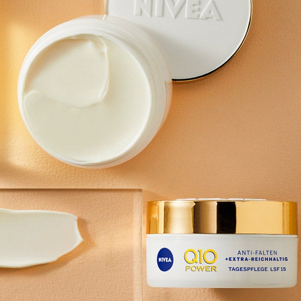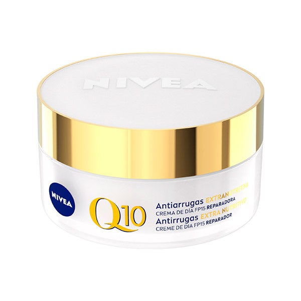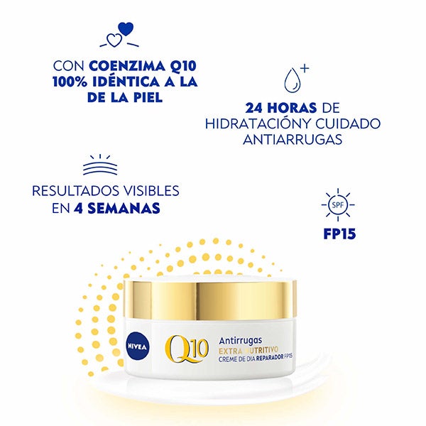 NIVEA Q10 Antiarrugas Creme de Dia Extra-Nutritivo foi especialmente desenvolvido para as necessidades da pele seca ou muito seca. Sua fórmula com Coenzima Q10 100% idêntica à da pele atua como proteção antioxidante e fornecedor de energia. Protege as células da pele contra agressores externos e recarrega a pele de energia, ajudando as células a se regenerarem melhor*. Contém também Óleo de Argan orgânico, que reforça a barreira da pele e a nutre intensamente durante 24 horas. Reduz visivelmente as rugas profundas em 4 semanas e reafirma a pele em 2 semanas. Com FP15 protege da radiação UVA/UVB. O resultado? Pele mais firme para 97% das mulheres** em duas semanas, e reduz visivelmente as rugas profundas em quatro semanas. Dermatologicamente comprovado. in vitro *Estudo de 2 semanas com 33 mulheres, 2019.