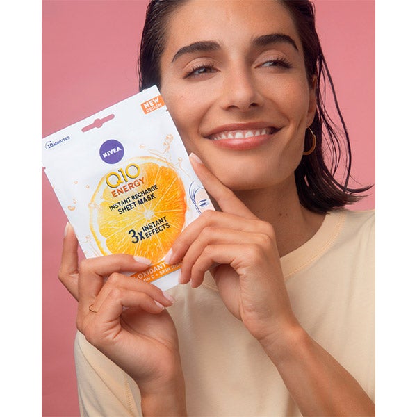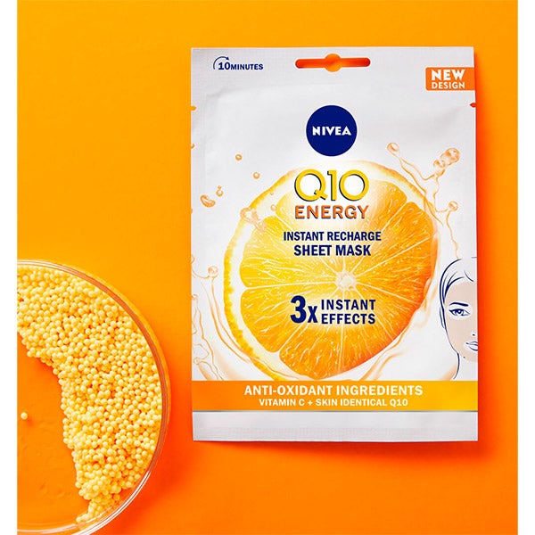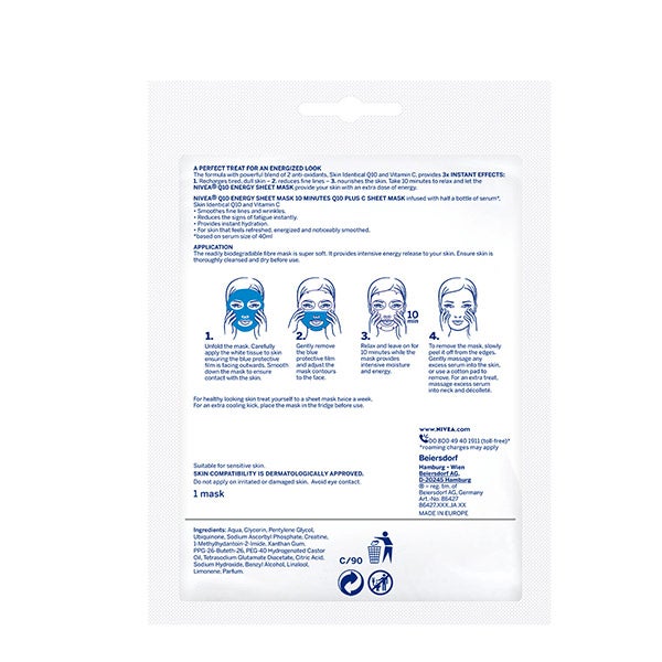 A máscara de tecido NIVEA Q10 ENERGY Tissue Mask Antiarrugas, infundida com coenzima Q10 e Vitamina C, recarrega imediatamente a pele cansada e opaca, proporcionando-lhe uma dose extra de energia. Sua fórmula contém coenzima Q10 idêntica à da pele e vitamina C, uma poderosa combinação de dois eficazes antioxidantes que oferece 3 efeitos instantâneos: reduz os sinais de fadiga, suaviza as rugas e linhas de expressão e nutre a pele. A máscara de tecido está impregnada com uma dose equivalente a meio frasco de sérum de coenzima Q10 e vitamina C*, para que sua pele pareça fresca, radiante, luminosa e suave em apenas 10 minutos. Relaxe e deixe que esta agradável máscara forneça à sua pele a dose extra de energia que precisa. Você pode usar até duas máscaras por semana e se quiser adicionar um extra de frescor ao seu rosto, resfrie-a na geladeira antes de usar.