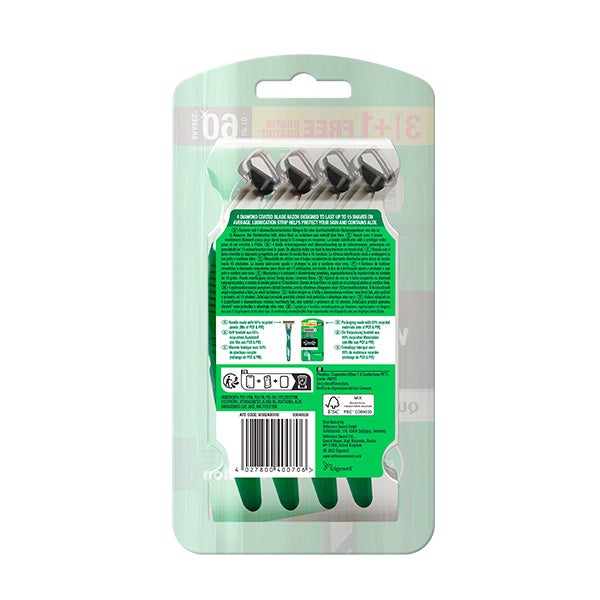 4 lâminas revestidas de titânio e diamante. Maior resistência e durabilidade para um barbear de alto desempenho sem esforço. Lâmina de precisão na parte traseira. Banda lubrificante com Aloe e Vitamina E