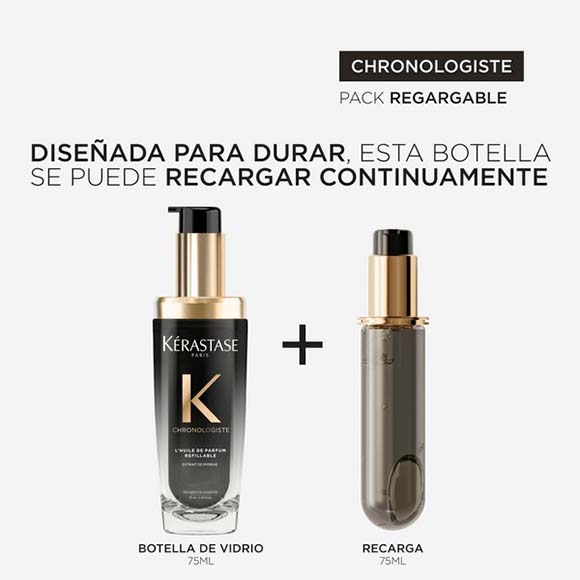 Com uma infusão de extrato de mirra, Kérastase Chronologiste L'Huile de Parfum é uma fragrância em óleo para o cabelo composta por uma combinação excepcional de notas nobres do mundo das fragrâncias finas: Rosa de Chá, Madeiras Leves e Almíscar. Delicadamente perfumado, o cabelo é revitalizado, hidratado e encorpado após algumas gotas.