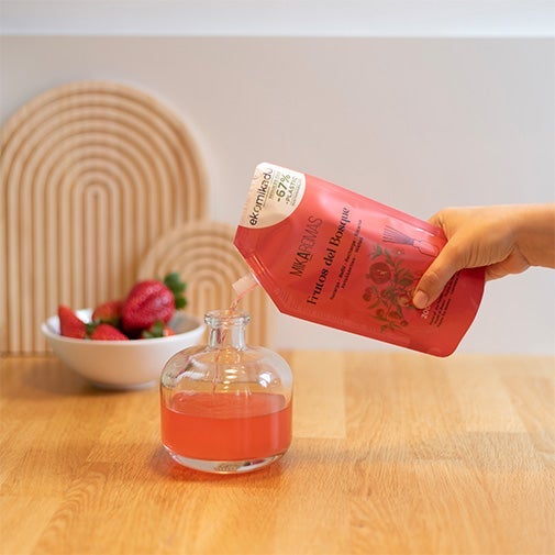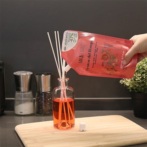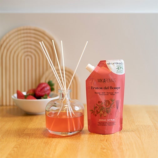 EKOMIKADO é uma recarga de ambientador mikado em um formato inovador, uma bolsa doypack que reduz o consumo de plástico e a pegada de carbono em comparação com outras opções tradicionais, como os formatos de reposição em garrafa de plástico. É uma resposta ao seu compromisso, e ao nosso, com o consumo responsável. Permite utilizar um recipiente à sua escolha para colocar a fragrância e está disponível em nossos 4 aromas mais vendidos.
