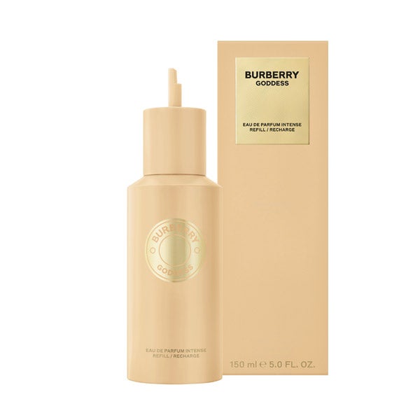 Inspirada nas cores do pôr do sol, a recarga Burberry Goddess Eau de Parfum Intense é apresentada em um frasco que abriga uma leve fragrância ambarada. A embalagem bege escuro com uma etiqueta dourada inspirada em um trench coat faz referência ao legado da marca.
