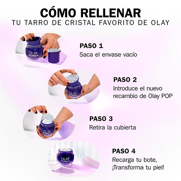 Você adora seu creme hidratante Olay? Seu pote de vidro roxo favorito está vazio? Guarde-o e reabasteça com Olay POP. Retire a embalagem vazia e insira o refil de Olay Retinol24 para continuar desfrutando do nosso creme renovador noturno hidratante e obter resultados visíveis na pele. Nossa fórmula renovadora para o cuidado da pele é elaborada com Propionato de Retinol, que penetra até 10 camadas superficiais de profundidade para ajudar a suavizar a textura da pele, e Vitamina E, um antioxidante de eficácia comprovada conhecido por combater os danos causados pelos radicais livres e ajudar a manter a pele com uma aparência jovem. Desfrute do poder da hidratação 24 horas, que mantém sua pele hidratada durante toda a noite. Em apenas uma noite, 96% das mulheres acordaram com a pele mais suave. Com o tempo, as linhas de expressão e as rugas se atenuam visivelmente. Quando procurar cremes que contenham retinol, eleve o nível do cuidado com sua pele: sem perfume, Olay Retinol24 tem uma textura suave como a seda, não oleosa e de rápida absorção. Nossa fórmula foi aprovada dermatologicamente pela Skin Health Alliance por sua eficácia na renovação da pele.
