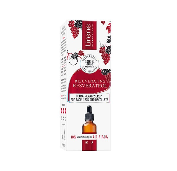 O sérum ultrarreparador contém uma combinação inovadora de componentes da uva: resveratrol, hidrolato de uva, vitis vinifera e extrato de sementes de uva, com 10% de complexo de vitaminas A, C, E, B3, B5.