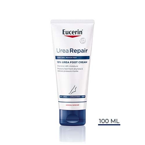 Eucerin UreaRepair PLUS Creme para Pés 10% Ureia contém Ureia, Ceramida e fatores naturais de hidratação (NMF). Tem uma capacidade clinicamente comprovada de proporcionar ao mesmo tempo alívio imediato, hidratação intensa e proteção aos pés com a pele muito seca, áspera e tensa. Fortalece a barreira natural da pele e torna-a mais resistente à desidratação, até durante 48 horas. Ajuda a amaciar a pele extremamente seca e cura as rachaduras dos calcanhares. É adequado para quem sofre de xerose, psoríase, diabetes e pele madura. Também pode ser usado como cuidado complementar.