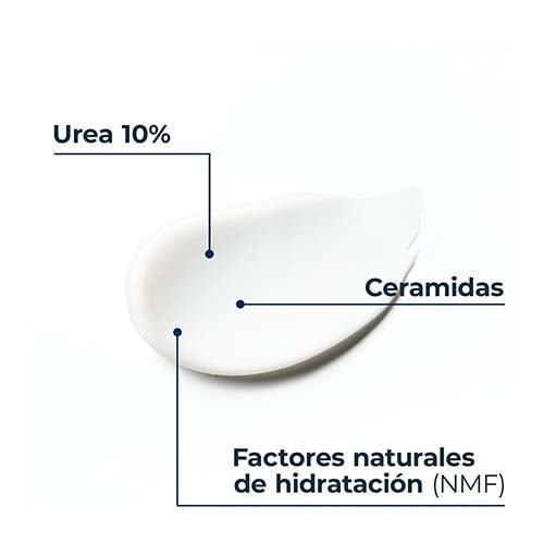 Agua, urea, glicerina, alcohol cetearílico, triglicérido caprílico/cáprico, estearato de glicerilo, cocoato de etilhexilo, glicéridos de coco hidrogenados, octildodecanol, lactato de sodio, estearato de glicerilo SE, fosfato de almidón, Ceramida NP, Ácido Láctico, Arginina HCL, Sodio PCA, Colesterol, Aceite de Semilla de Helianthus Annuus, Alanina, Carnitina, Glicina, Cloruro de Sodio, Dimeticona, Carbómero, Estearato de Sorbitán, Sulfato de Cetearilo y Sodio, Fenoxietanol.