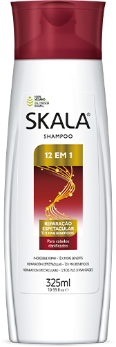 O Shampoo Skala 12 em 1, enriquecido com vitamina E e D'Pantenol, oferece uma restauração espetacular e nutrientes vitais com propriedades que atuam diretamente sobre o cabelo para combater os principais sinais de dano: secura, pontas duplas, falta de brilho, quebra, aspereza, desidratação, porosidade e perda de vitalidade.