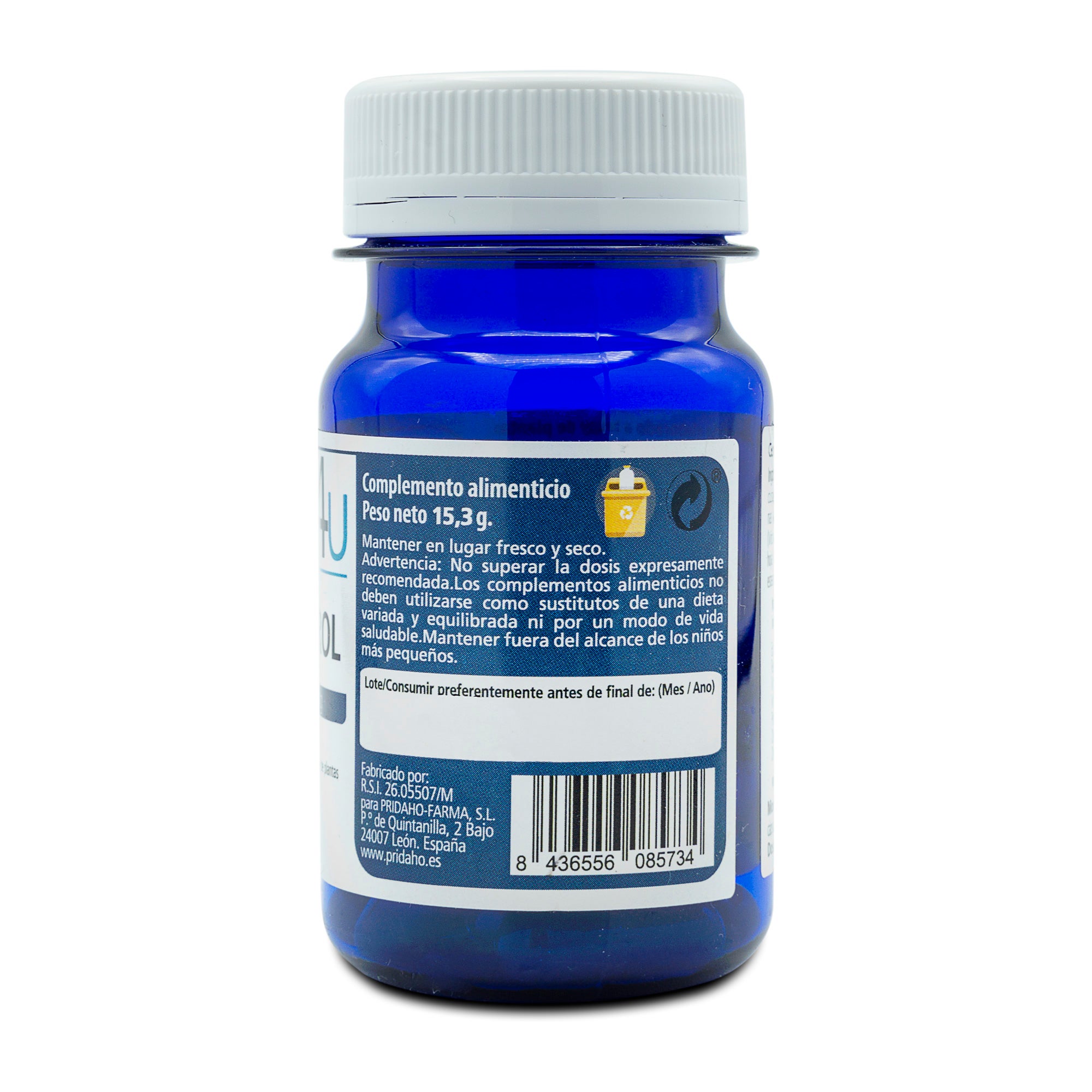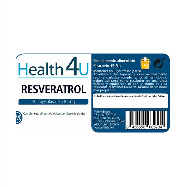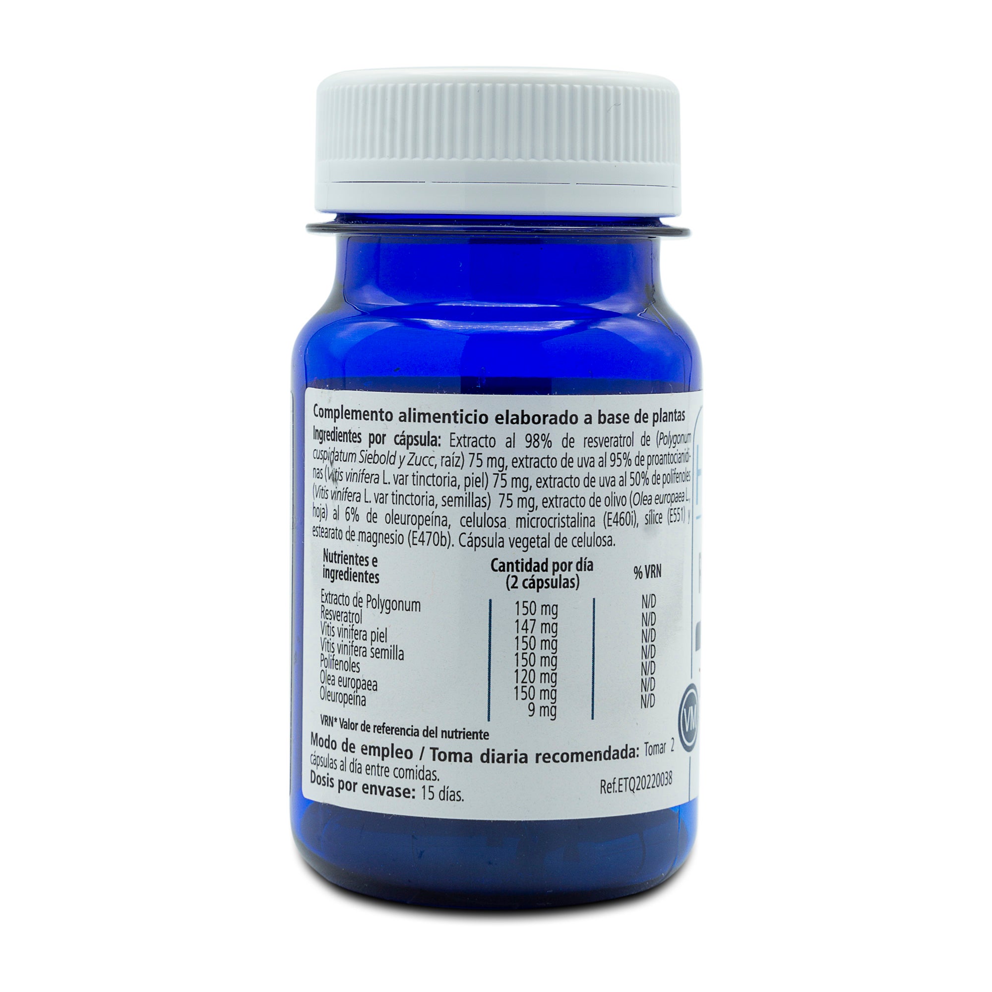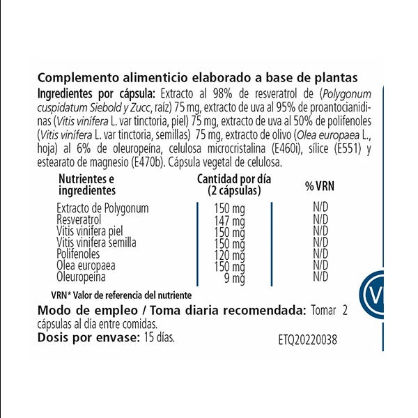 Ingredientes por cápsula: Extracto al 98% de resveratrol de (Polygonum cuspidatum Siebold yZucc, raíz) 75 mg, extracto de uva al 95% de proantocianidinas (Vitis vinÍfera L. var tinctoria, piel) 75 mg, extracto de uva al 50% de polifenoles (Vitis vinÍfera L. var tinctoria, semillas) 75mg, extracto de olivo (Olea europaea L., hoja) al 6% de oleuropeÍna, celulosa microcristalina (nE460i), sílice (E551) y estearato de magnesio (E470b). Cápsula vegetal de celulosa.