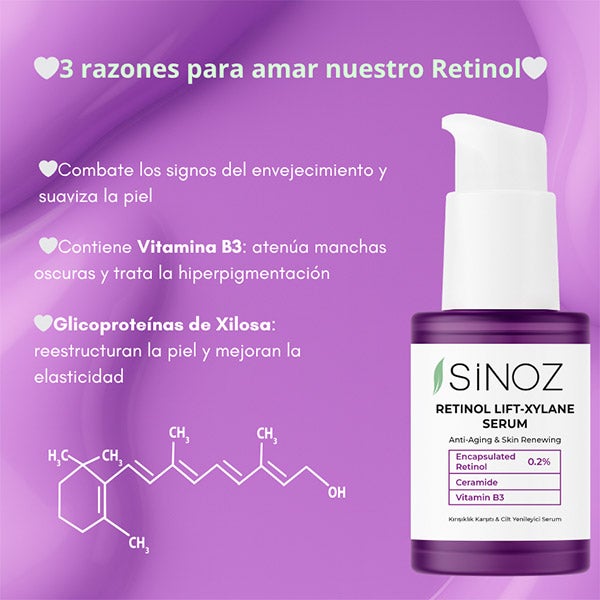 O Sérum de Retinol Lift-Xylane da Sinoz é um tratamento intensivo antienvelhecimento formulado para reduzir linhas finas, melhorar a elasticidade e uniformizar o tom do rosto. Sua fórmula avançada combina Retinol, Vitamina B3 (Niacinamida) e Glicoproteínas derivadas de Xilose, que atuam em sinergia para renovar, alisar e rejuvenescer a pele visivelmente.