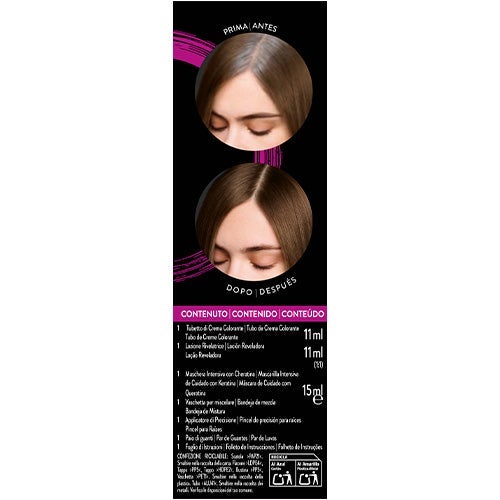 Crema Colorante: Aqua (Agua), Alcohol Cetearílico, Hidróxido de Amonio, Estearato de Glicerilo SE, Ceteareth-20, Octildodecanol, Sulfato de Sodio Laureth, Tolueno-2,5-Diamine Sulfate, Sodium Cetearyl Sulfate, Parfum (Fragancia), Oleic Acid, Ethanolamine, Resorcinol, Glycerin, Sodium Sulfite, 4-Chlororesorcinol, Etidronic Acid, Carbomer, m-Aminophenol, Potassium Hydroxide, Ascorbic Acid, Hydrolyzed Keratin, Linalool, Citronellol, Ethyl Linalool, Sodium Sulfate, Benzoic Acid.