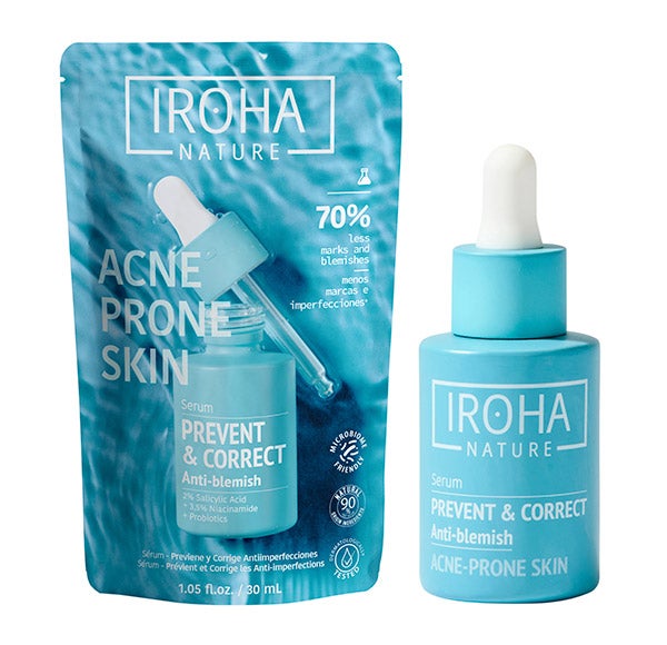 Sérum Previene y Corrige Antiimperfecciones de Iroha Nature, un tratamiento a base de 2% ácido salicílico, 3,5% Niacinamida y probióticos que elimina y mejora las marcas y cicatrices post-granos, mejora la textura de la piel, unifica el tono de la piel e impide la aparición de nuevos brotes de granos, impidiendo que se reproduzca la bacteria causante de ellos, C. Acnes. Su fórmula efectiva y altamente concentrada, con resultados probados y testada dermatológicamente, presenta una textura ligera y fluida que se absorbe rápidamente, con un acabado no pegajoso.