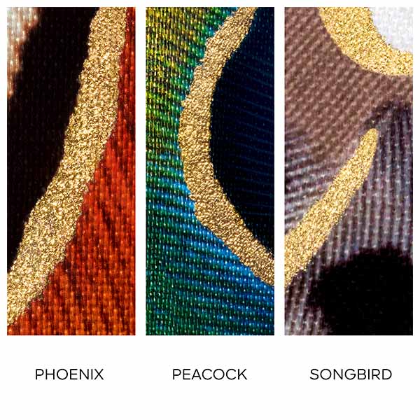 - Phoenix: inspirado nas penas da fênix, o impactante contraste do vermelho vivo e o delicado bege salpicado, realçado com um toque de dourado.