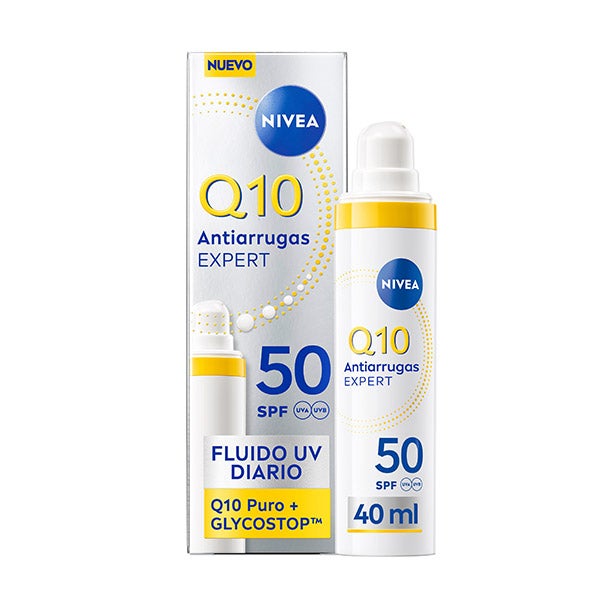 NIVEA Q10 Antiarrugas Expert Fluido UV Diario SPF50 40ml: Aqua, Glycerin, Butyl Methoxydibenzoylmethane, Bis-Ethylhexyloxyphenol Methoxyphenyl Triazine, Isopropyl Palmitate, Alcohol Denat., C12-15 Alkyl Benzoate, Distarch Phosphate, Glyceryl Stearate, Dibutyl Adipate, Ethylhexyl Triazone, Butylene Glycol Dicaprylate/Dicaprate, Phenylbenzimidazole Sulfonic Acid, Tapioca Starch, Cetyl Alcohol, Stearyl Alcohol, Cocoglycerides, Diethylamino Hydroxybenzoyl Hexyl Benzoate, Ubiquinone, Creatine, 1-Methylhydantoin-2-Imide, Acetyl Hydroxyproline, Glycyrrhiza Inflata Root Extract, Sodium Stearoyl Glutamate, Caprylyl Glycol, Ethylhexylglycerin, Xanthan Gum, Trisodium EDTA, Sodium Hydroxide, Phenoxyethanol, Parfum