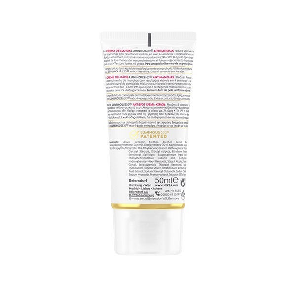 Luminous Crema de manos: Aqua, Cetearyl Alcohol, Alcohol Denat., Butyl Methoxydibenzoylmethane, Glycerin, Cocoglycerides, C12-15 Alkyl Benzoate, Butylene Glycol Dicaprylate/Dicaprate, Bis-Ethylhexyloxyphenol Methoxyphenyl Triazine, Glyceryl Stearate, Dibutyl Adipate, Ethylhexyl Triazone, Ethylhexyl Salicylate, Butyrospermum Parkii Butter, Phenylbenzimidazole Sulfonic Acid, Diethylamino Hydroxybenzoyl Hexyl Benzoate, Stearyl Alcohol, Caprylyl Glycol, Isobutylamido Thiazolyl Resorcinol, Sodium Hyaluronate, Tapioca Starch, Xanthan Gum, Arctium Lappa Fruit Extract, Sodium Stearoyl Glutamate, Sodium Chloride, Sodium Hydroxide, Phenoxyethanol, Trisodium EDTA, Parfum