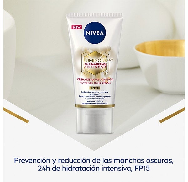 Luminous Creme de mãos: NIVEA Luminous630® Antimanchas Creme de Mãos Avançada nutre intensivamente a pele das mãos enquanto reduz as manchas e previne seu aparecimento.