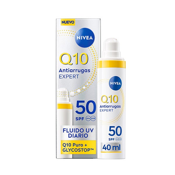 NIVEA Q10 Antiarrugas Expert Fluido UV Diario SPF50 40ml: Aqua, Glycerin, Butyl Methoxydibenzoylmethane, Bis-Ethylhexyloxyphenol Methoxyphenyl Triazine, Isopropyl Palmitate, Alcohol Denat., C12-15 Alkyl Benzoate, Distarch Phosphate, Glyceryl Stearate, Dibutyl Adipate, Ethylhexyl Triazone, Butylene Glycol Dicaprylate/Dicaprate, Phenylbenzimidazole Sulfonic Acid, Tapioca Starch, Cetyl Alcohol, Stearyl Alcohol, Cocoglycerides, Diethylamino Hydroxybenzoyl Hexyl Benzoate, Ubiquinone, Creatine, 1-Methylhydantoin-2-Imide, Acetyl Hydroxyproline, Glycyrrhiza Inflata Root Extract, Sodium Stearoyl Glutamate, Caprylyl Glycol, Ethylhexylglycerin, Xanthan Gum, Trisodium EDTA, Sodium Hydroxide, Phenoxyethanol, Parfum
