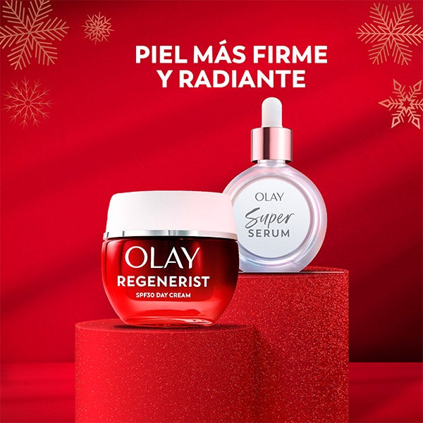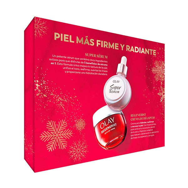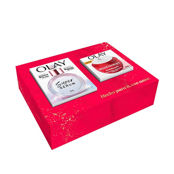 Ofereça à sua pele uma transformação noturna completa com o estojo de Olay Regenerist SPF & SS30, que combina um creme noturno regenerador com um sérum multiação de alta eficácia. O creme diurno é formulado com Niacinamida e Peptídeos antienvelhecimento. Proporciona hidratação, melhora a firmeza e ajuda a reduzir a aparência das linhas de expressão e rugas. Ao mesmo tempo, ativa a renovação celular natural para melhorar a textura e o tom da pele. Com proteção SPF, é ideal para uso diário. O Super Sérum 5 em 1 e sua fórmula exclusiva, composta por cinco ingredientes ativos, melhora visivelmente a textura da pele, uniformiza o tom, firma, reduz as rugas e linhas de expressão, e proporciona uma hidratação duradoura. Graças a este duo complementar, cada noite se torna uma oportunidade para uma regeneração profunda e visível da pele