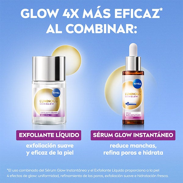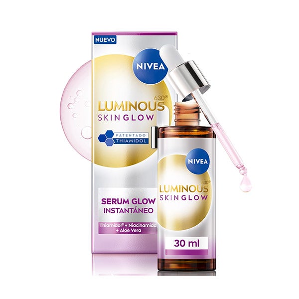 LUMINOUS630® SKIN GLOW Sérum Glow Instantâneo, o primeiro sérum da NIVEA que aborda as múltiplas dimensões do glow na pele: 1. TOM UNIFORME: uniformiza a pele em 3 dias e reduz clinicamente as manchas escuras em 14 dias. 2. REFINA POROS: refina os poros e alisa a pele em 3 dias. 3. HIDRATAÇÃO: hidratação fresca instantânea e a longo prazo. Hidrata a pele em profundidade. Sua fórmula inovadora contém Thiamidol®, um ingrediente antimanchas altamente eficaz patenteado pela NIVEA, além de Niacinamida para ajudar a reduzir o excesso de oleosidade e refinar os poros, e Aloe Vera que proporciona uma hidratação fresca instantânea.