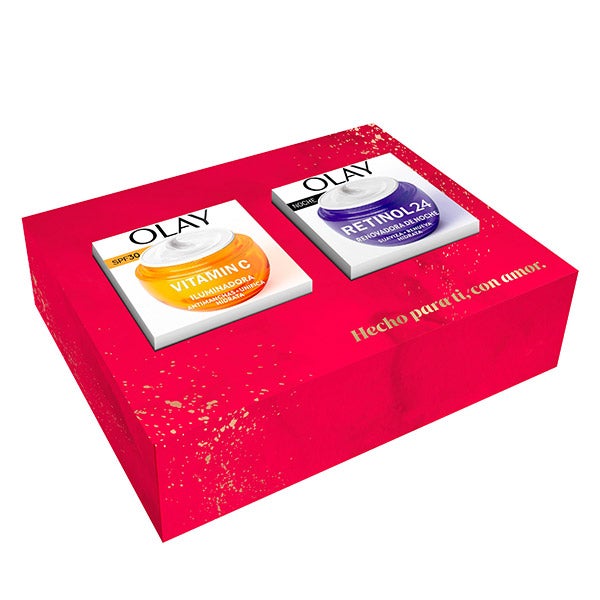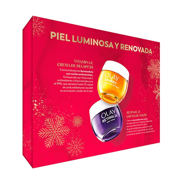 Descubra o estojo Olay Box Vitamina C SPF + Creme Noturno com Complexo Retinoide, uma rotina completa para o cuidado diário da sua pele. Este duo combina um creme diurno iluminador e um creme noturno regenerador. O creme hidratante é formulado com Vitamina C antioxidante e Niacinamida pura a 99%. Ajuda a reduzir a aparência das manchas, proporciona luminosidade e favorece a renovação celular ao penetrar até 10 camadas da pele. Sua textura leve e de rápida absorção a torna ideal para uso diário. O Creme Noturno Renovador com Retinol 24 é especialmente formulado para combater os sinais de envelhecimento, o tom opaco e as irregularidades na textura da pele. Enriquecido com um Complexo Retinoide, este creme penetra até 10 camadas em profundidade para alisar, regenerar e revelar uma pele visivelmente mais luminosa ao acordar. Além disso, contém Vitamina E com ação antioxidante, que protege a pele contra as agressões externas e ajuda a manter uma aparência jovem. Com este kit, Olay oferece uma experiência de cuidado facial completa, com fórmulas avançadas que se adaptam às necessidades da sua pele a cada dia.