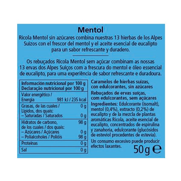 Edulcorante (isomalt), mentol (0,4%), extracto (0,2%) de eucalipto y de la mezcla de plantas aromáticas Ricola, aceite esencial de eucalipto, concentrados de espirulina y zanahoria, edulcorante (glucósidos de esteviol procedentes de la estevia).