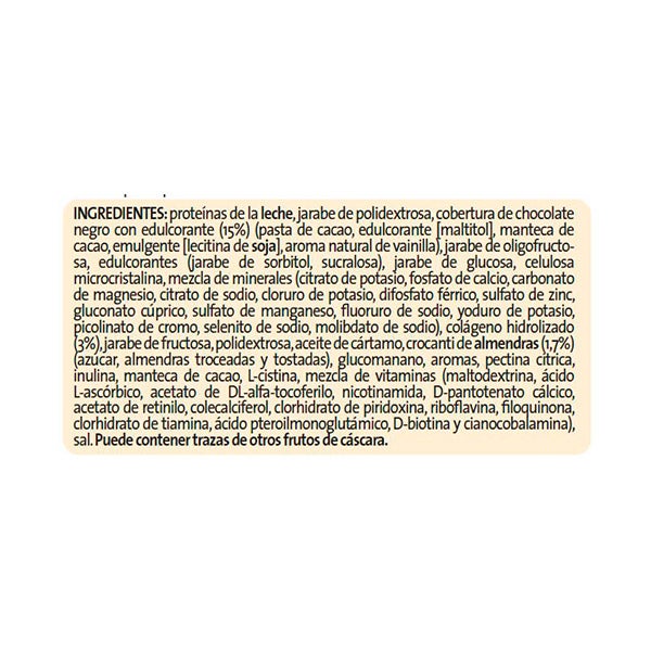 Proteínas de la leche, jarabe de polidextrosa, cobertura de chocolate negro con edulcorante (15%) (pasta de cacao, edulcorante [maltitol], manteca de cacao, emulgente [lecitina de soja], aroma natural de vainilla), jarabe de oligofructosa, edulcorantes (jarabe de sorbitol, sucralosa), jarabe de glucosa, celulosa microcristalina, mezcla de minerales (citrato de potasio, fosfato de calcio, carbonato de magnesio, citrato de sodio, cloruro de potasio, difosfato férrico, sulfato de zinc, gluconato cúprico, sulfato de manganeso, fluoruro de sodio, yoduro de potasio, picolinato de cromo, selenito de sodio, molibdato de sodio), colágeno hidrolizado (3%), jarabe de fructosa, polidextrosa, aceite de cártamo, crocanti de almendras (1,7%) (azúcar, almendras troceadas y tostadas), glucomanano, aromas, pectina cítrica, inulina, chitosán (crustáceos), manteca de cacao, L-cistina, mezcla de vitaminas (maltodextrina, ácido L-ascórbico, acetato de DL-alfa-tocoferilo, nicotinamida, D-pantotenato cálcico, acetato de retinilo, colecalciferol, clorhidrato de piridoxina, riboflavina, filoquinona, clorhidrato de tiamina, ácido pteroilmonoglutámico, D-biotina y cianocobalamina), sal.