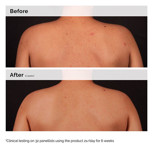 Solução para pele propensa a imperfeições: ajuda a clarear a pele corporal propensa a imperfeições, esfoliando os poros, contribuindo para suavizar a aparência de textura irregular e equilibrando a aparência de tom desigual da pele.