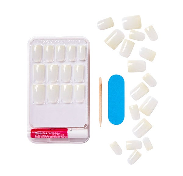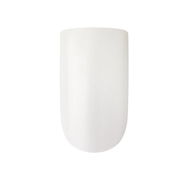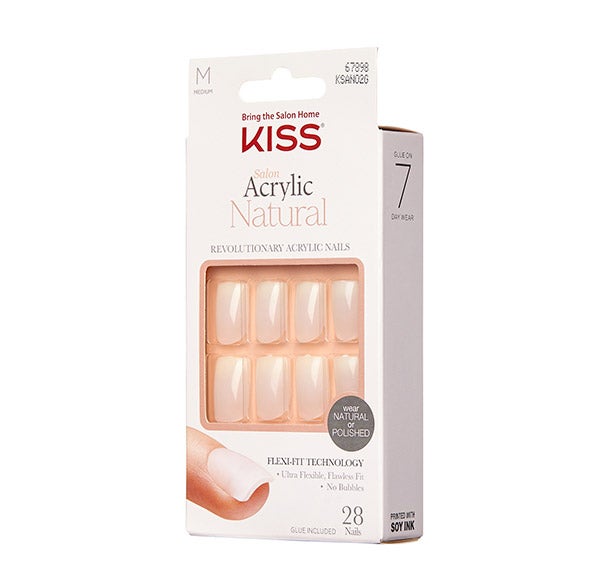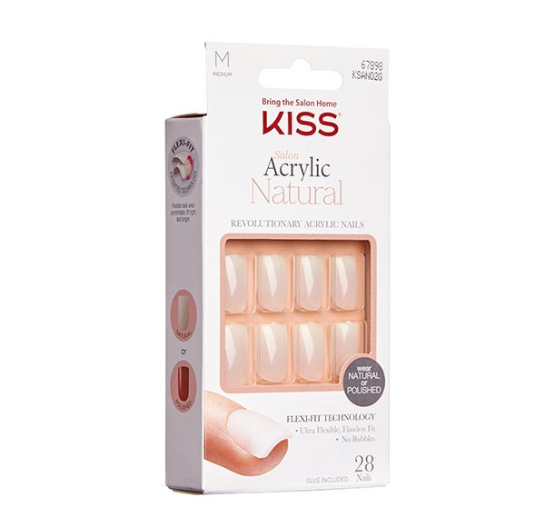 Kiss Unhas Postiças Salon Acrylic Natural são de comprimento médio com um acabamento nude e ponta branca.