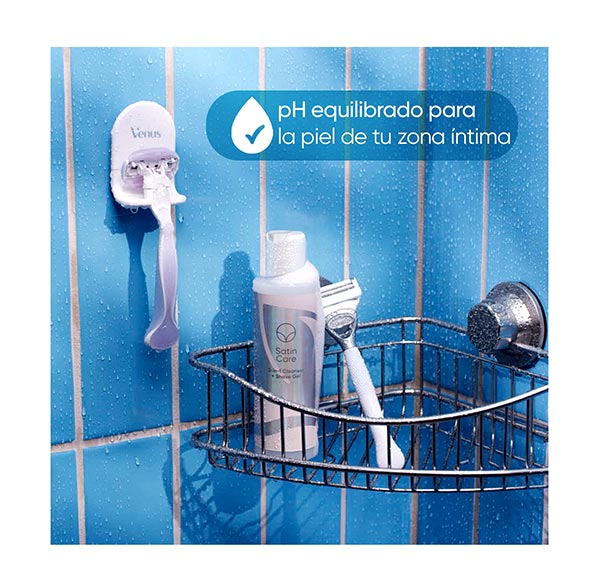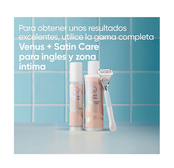 O gel 2-em-1 (gel de limpeza + gel de depilação) da Venus Satin Care é usado na depilação para criar uma camada protetora deslizante e evitar a irritação após a depilação, ou diariamente como limpador suave.