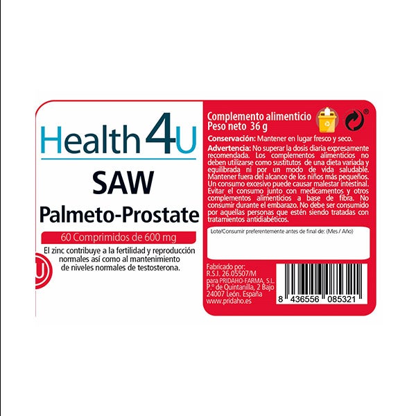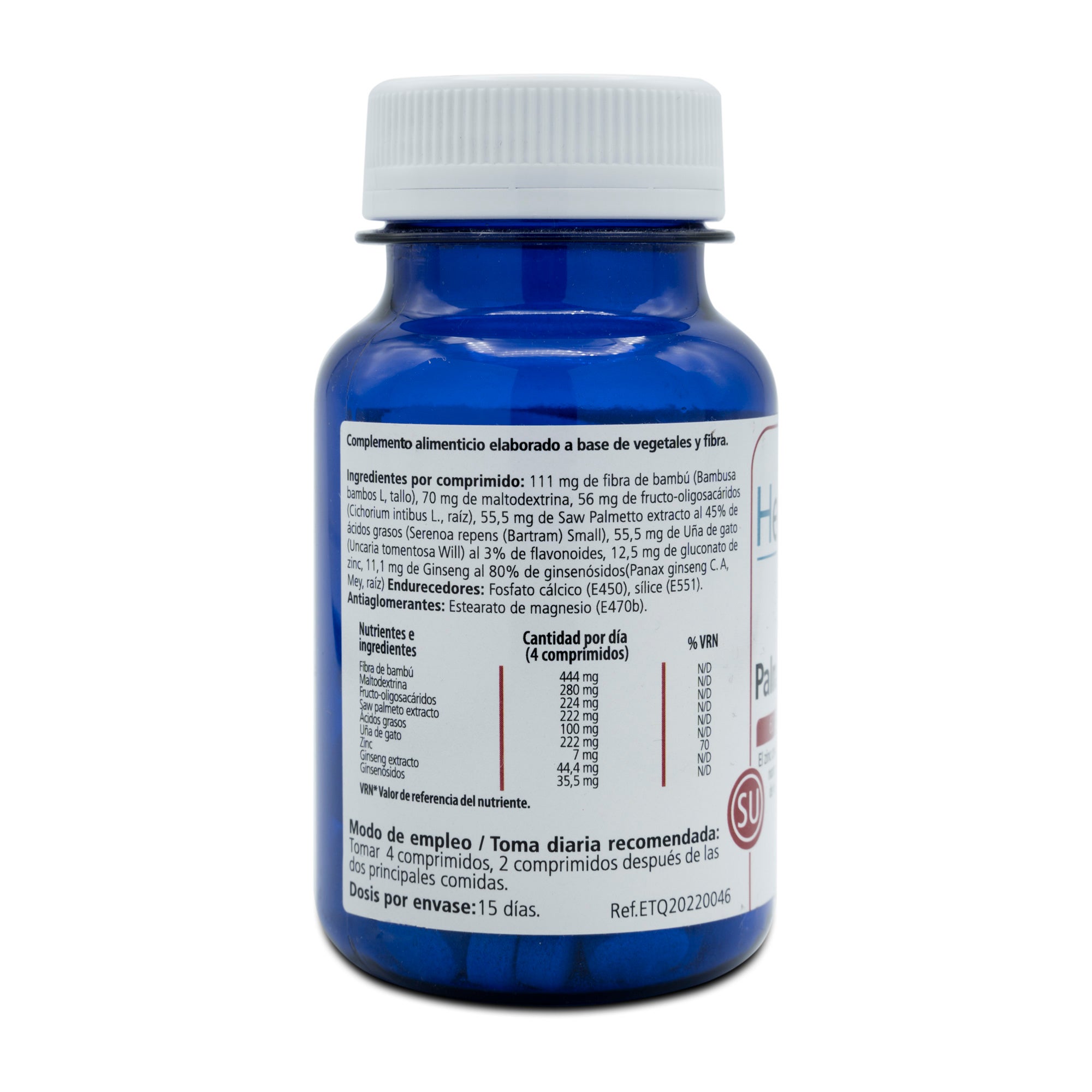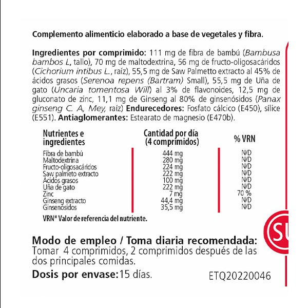 Ingredientes por comprimido: 111 mg de ¬fibra de bambú (Bambusa bambos L, tallo), 70 mg de maltodextrina, 56 mg de fructo-oligosacáridos (Cichorium intibus L., raíz), 55,5 mg de Saw Palmetto extracto al 45% de ácidos grasos (Serenoa repens (Bartram) Small), 55,5 mg de Uña de gato (Uncaria tomentosa Will) al 3% de flavonoides, 12,5 mg de gluconato de zinc, 11,1 mg de Ginseng al 80% de ginsenósidos (Panax ginseng C. A, Mey, raíz).