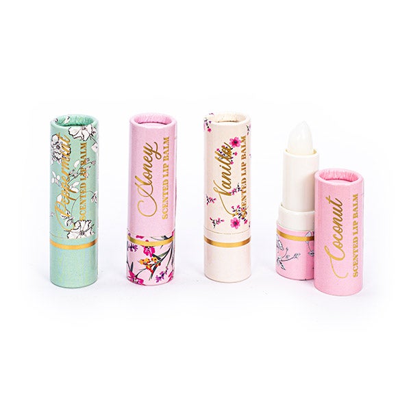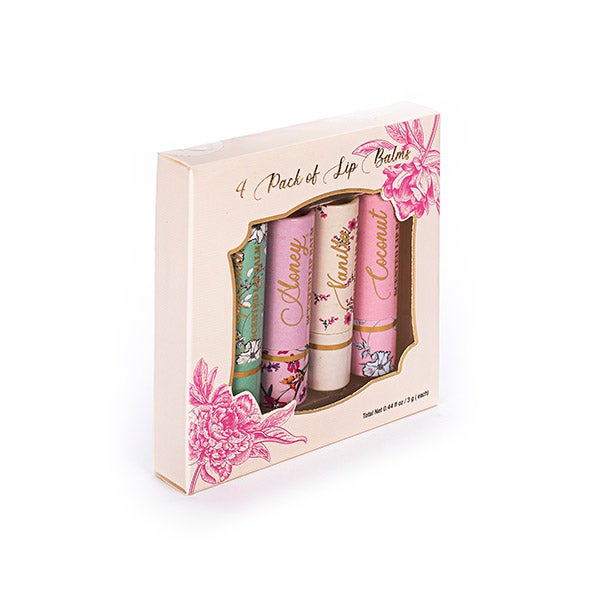 Com uma embalagem preciosa e floral, leve este conjunto de quatro bálsamos labiais com diferentes sabores.
