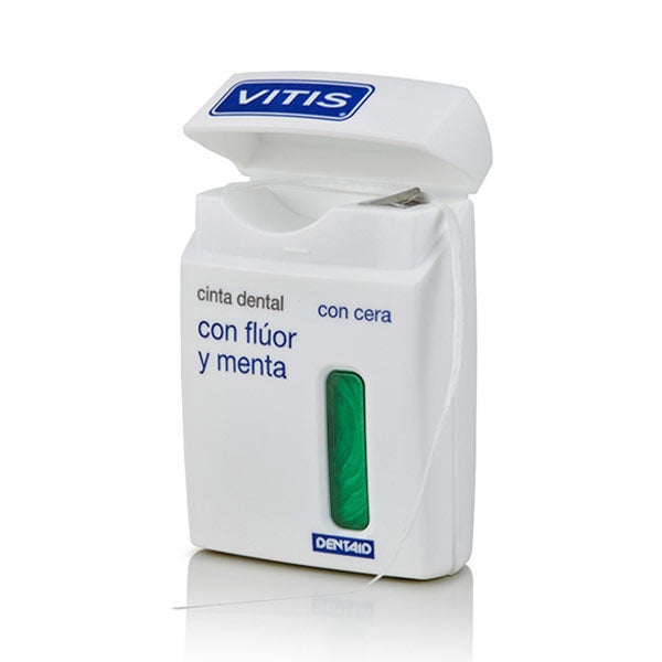 VITIS fita dental com flúor e menta, de perfil plano e fino, proporciona uma grande superfície de arraste para eliminar eficazmente o biofilme interdental.