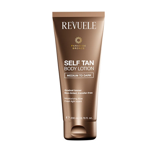 LOÇÃO CORPORAL AUTOBRONZEADORA REVUELE. Este bronzeador gradual sem sol dará à sua pele um impecável efeito bronzeado em apenas algumas horas e manterá o seu saudável brilho de verão durante dias.
