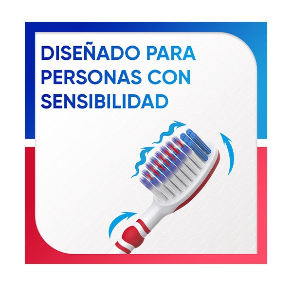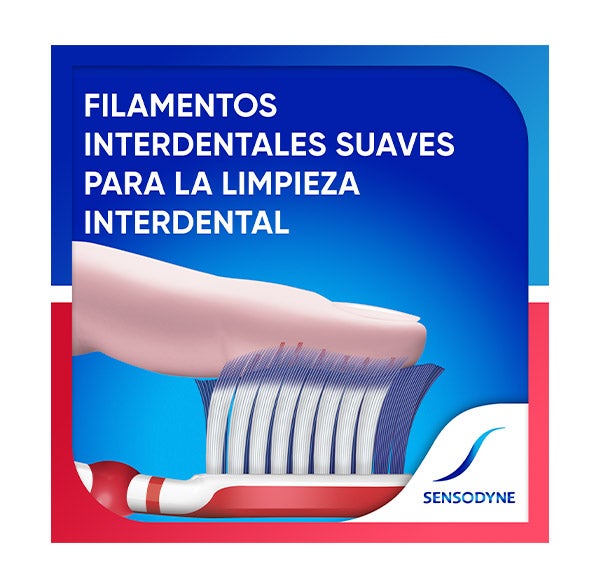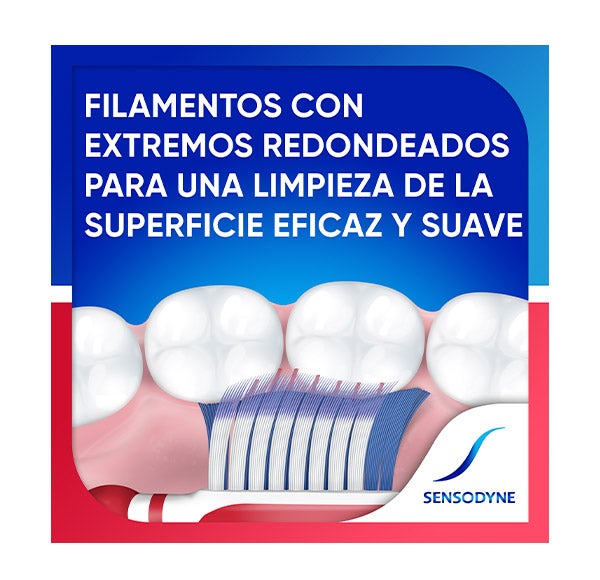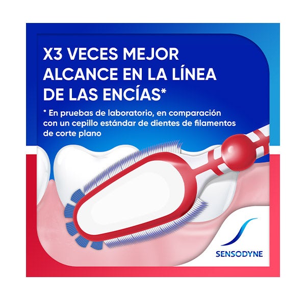 O escova de dentes Sensodyne Sensibilidade & Gengivas possui 3 tipos de cerdas para uma limpeza eficaz da superfície dentária, do espaço entre os dentes e da linha das gengivas. A Escova de Dentes Sensibilidade e Gengivas é suave com o esmalte e as gengivas.