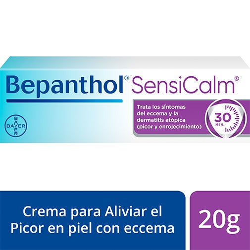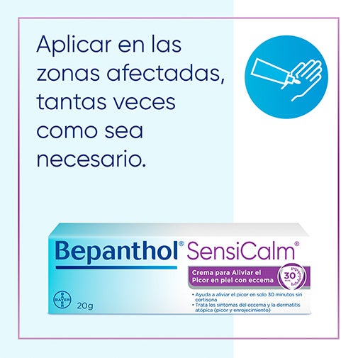 Bepanthol® SensiCalm® é um creme para a pele que alivia a vermelhidão e a coceira causada por irritações cutâneas ocasionais como eczema, dermatite atópica ou reações alérgicas em apenas 30 minutos. Graças à sua ação múltipla, o creme: