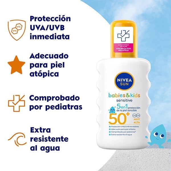 NIVEA SUN Babies & Kids Sensitive Spray Solar SPF 50+: Oferece proteção 5em1 para a pele sensível contra os danos dos raios UVA/UVB a longo prazo e queimaduras. Reduz o risco de alergias induzidas pelo sol, é livre de fragrância e é extra resistente à água. Adequado para pele atópica, comprovado por pediatras. Respeitosa com os oceanos: Sem os filtros UV Octinoxato, Oxybenzone, Octocrileno e livre de microplásticos.