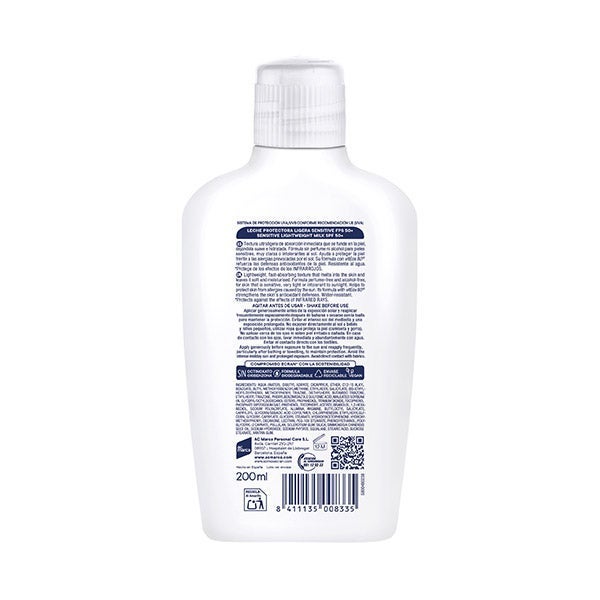 Leite protetor leve para peles sensíveis e atópicas. Fórmula superior x4 anti: alergias solares, coceiras, vermelhidões e secura.