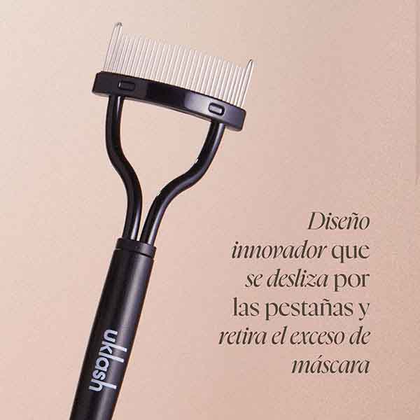 O separador de cílios UKLASH é um pente inovador que desliza através dos cílios para eliminar o excesso de máscara, deixando-os separados, definidos e sem grumos.