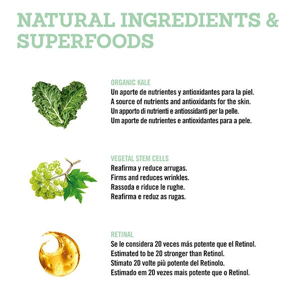 Um super sérum antienvelhecimento intensivo com uma fórmula superativada, que combina milhares de células-tronco vegetais em cada gota combinadas com o poder do retinal.