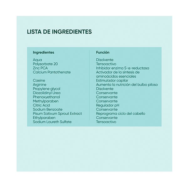 Aqua, Polysorbate 20, Betaine, Calcium Pantothenate, Pisum Sativum (Pea) Sprout Extract, Zinc PCA, Pyrrolidinyl Diaminopyrimidine Oxide Oxothiazolidinecarboxylate, Arginine, Cafeine, Pectin, Phenoxyethanol, Ethyl Hexyl Glycerin, Xanthan Gum, Sodium Benzoate, Mannitol, Phosphatidylcholine, Glycerin, Methylpropanediol, Cetyl Alcohol, Caprylyl Glycol, Sorbitan Oleate, Xanthan Gum, Tocopheryl Acetate, Cetrimonium Chloride, Sodium Laureth Sulfate, Citric Acid, Sodium Chloride, Phenylpropanol, Phytosphingosine.