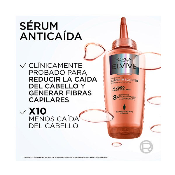 O sérum antiqueda L'Oréal Paris Elvive Growth Booster é um tratamento intensivo projetado para prevenir a queda de cabelo e estimular o crescimento do cabelo já existente. Formulado com Aminexil-R™, este sérum ancora o cabelo à raiz e reforça o ciclo de vida capilar. Clinicamente testado, este protocolo intensivo de 6 semanas ajuda a aumentar a densidade capilar com +7000 fibras capilares visivelmente mais fortes.*