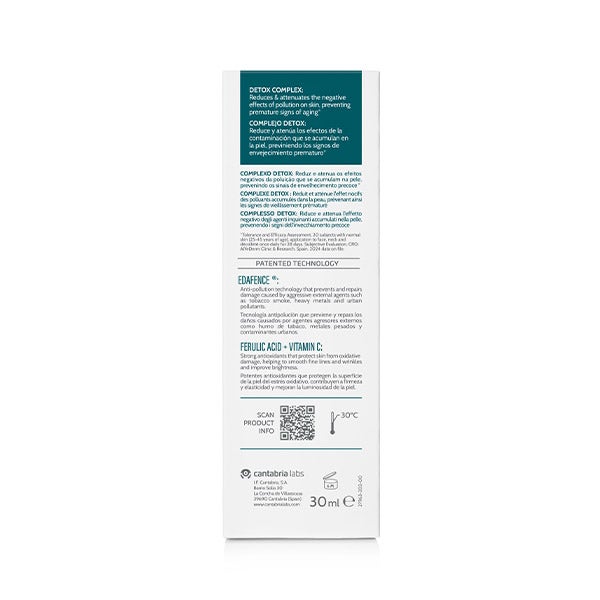 Sua fórmula conta com EDAFENCE®, inovadora tecnologia antipoluição com eficácia demonstrada, contra metais pesados, fumaça de tabaco, poluentes urbanos incluindo o ozônio presente tanto em áreas urbanas quanto em áreas rurais, a luz azul (luz emitida por dispositivos digitais) e com o exclusivo Advanced Antiox Synergy, sistema antioxidante de última geração e alta tolerância, graças à nossa tecnologia SCA® Growth Factor Technology com atividade antioxidante e reparadora e EDAFENCE® combinadas com vitamina C, Ácido ferúlico e Vitamina E.