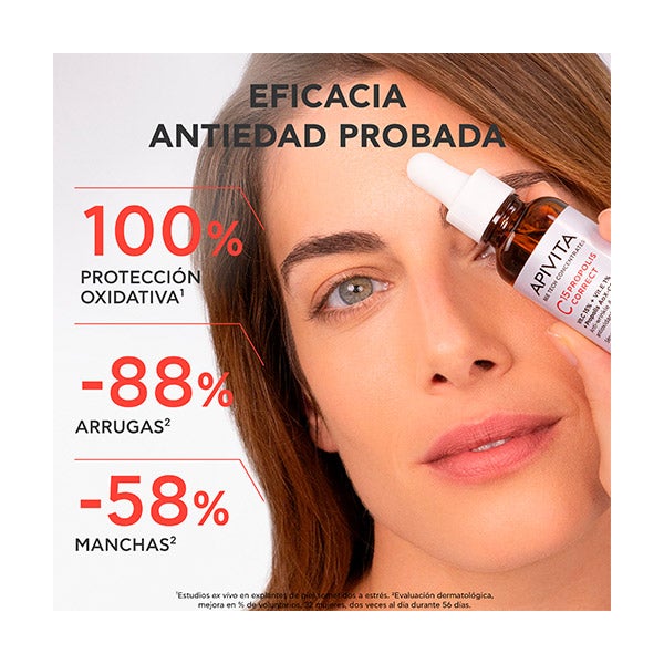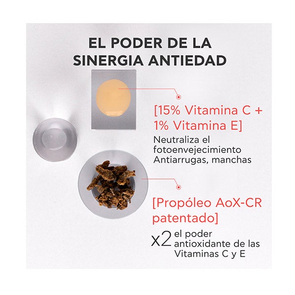 Sérum Corretor C15 Própolis revela o poder da sinergia antienvelhecimento da Vitamina C, Vitamina E e Própolis Aox-CR patenteado.