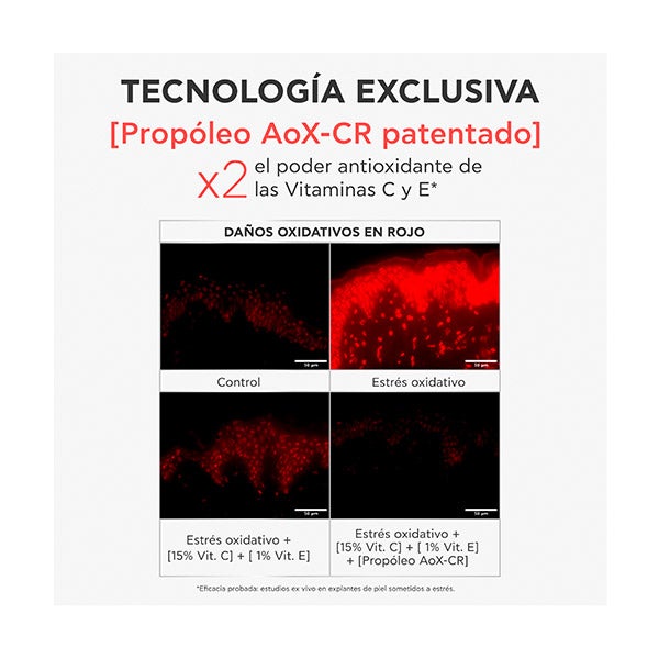 Sua eficácia incomparável foi demonstrada frente ao duplo poder antioxidante da Vitamina C + E, reforçando os resultados antienvelhecimento dessa combinação sinérgica.