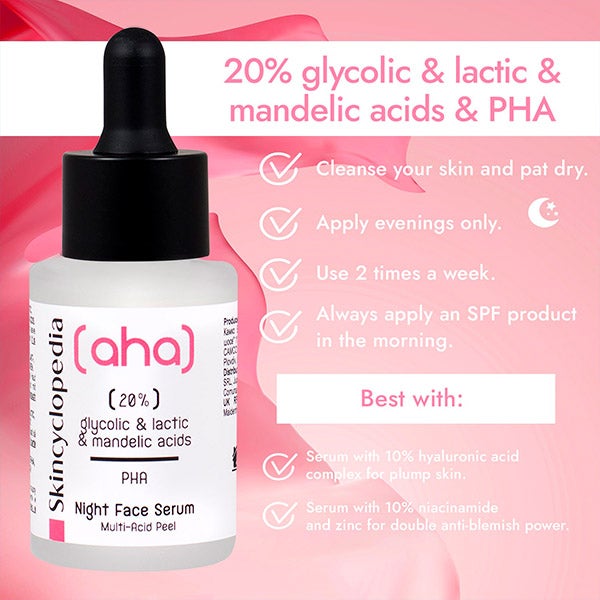 Sérum facial com ação peeling para a noite, com ácidos lático, glicólico, mandélico e polihidroxilado.